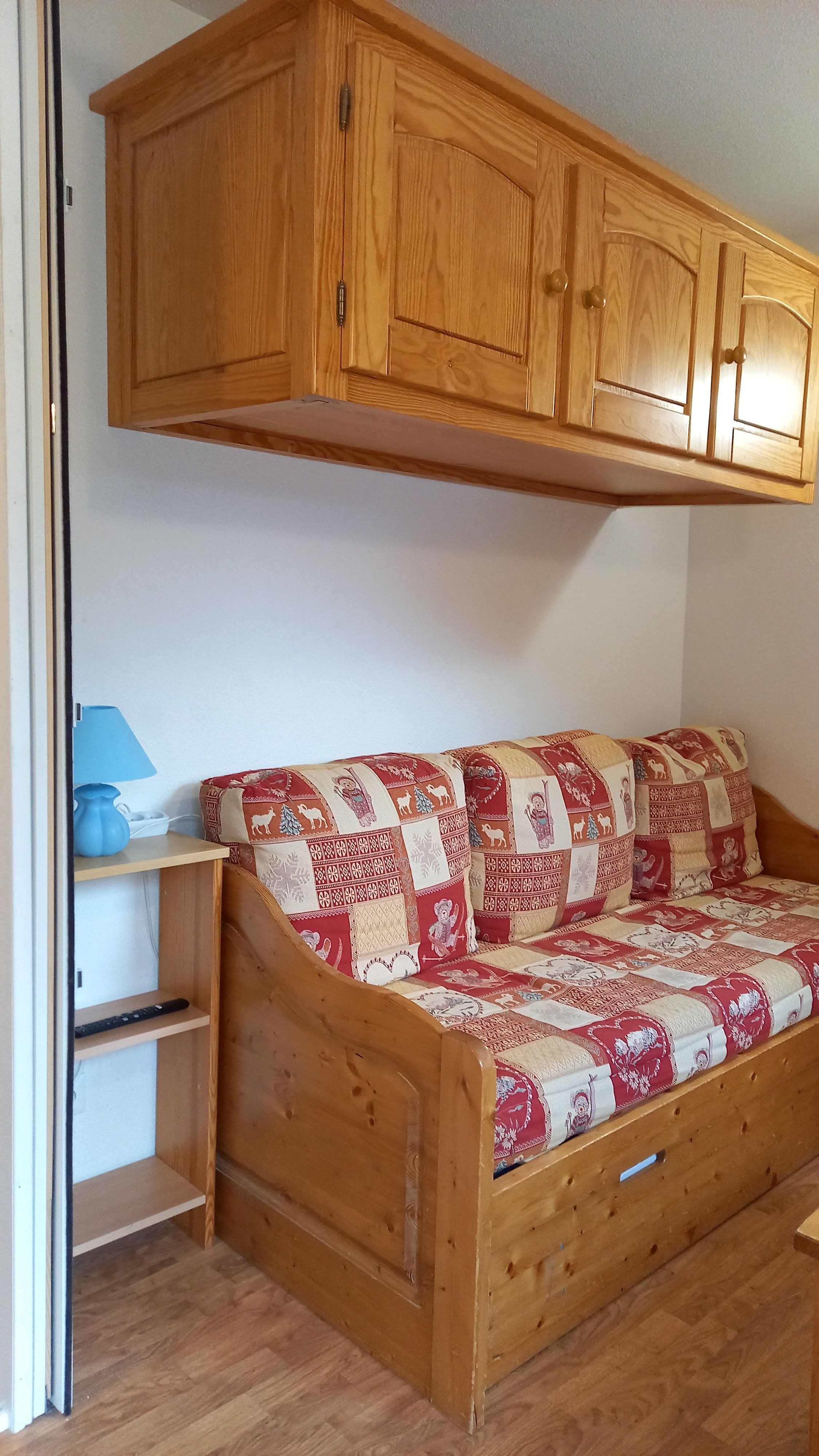 Salon avec canapé - lits gigognes.(2 lits de 80) Une cloison amovible permet de transformer le salon en chambre.