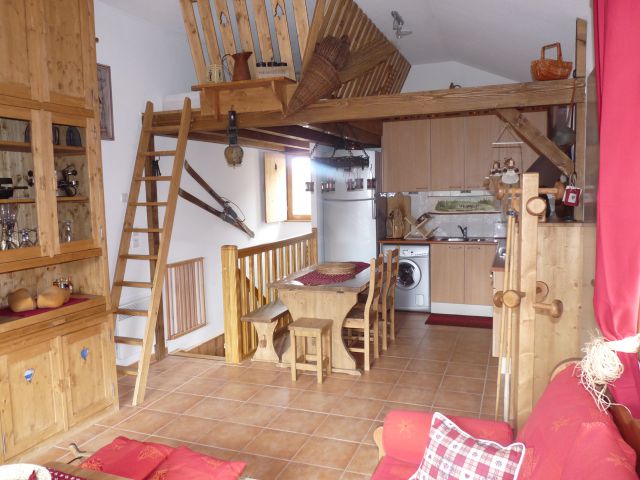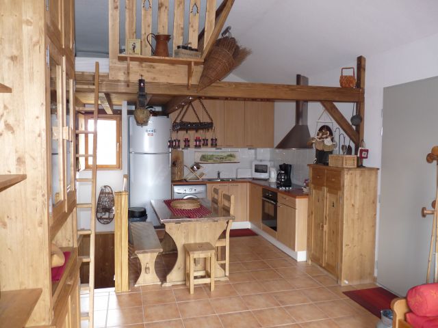 DEMI CHALET EN DUPLEX, 50 M2, 1 CHAMBRE LIT DOUBLE, 1 CHAMBRE LIT SUPERPOSE, 1 COUCHAGE DOUBLE EN MEZZANINE. CUISINE EQUIPEE: PLAQUES, FOUR, MICRO-ONDES, GRAND FRIGO CONGELATEUR, LAVE VAISSELLES ET LAVE LINGE. LIT PARAPLUIE BEBE COMPRIS.