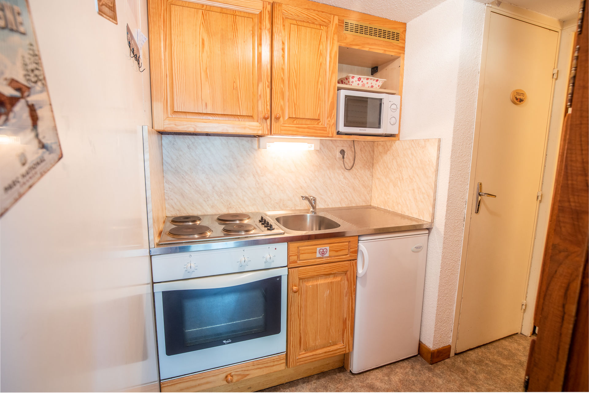 Coin cuisine : plaques électriques, four, four micro-ondes, réfrigérateur et tout le nécessaire de vaisselle