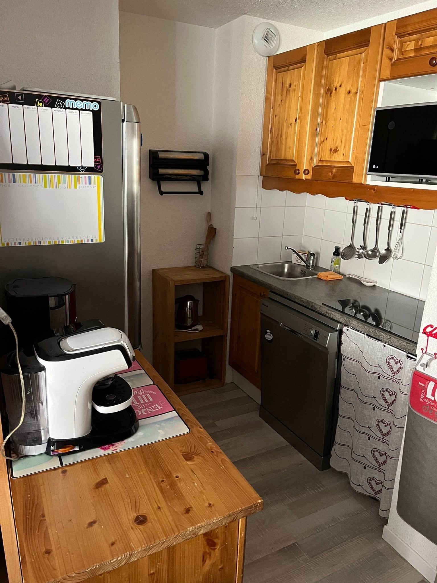 - Un coin cuisine équipé : réfrigérateur avec compartiment congélateur, lave-vaisselle, plaque de cuisson, four micro-onde/four , cafetière filtre et cafetière Tassimo, bouilloire électrique, grille-pain.