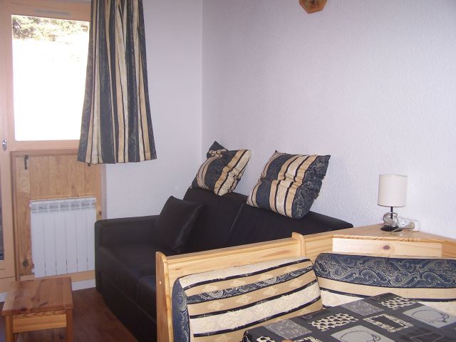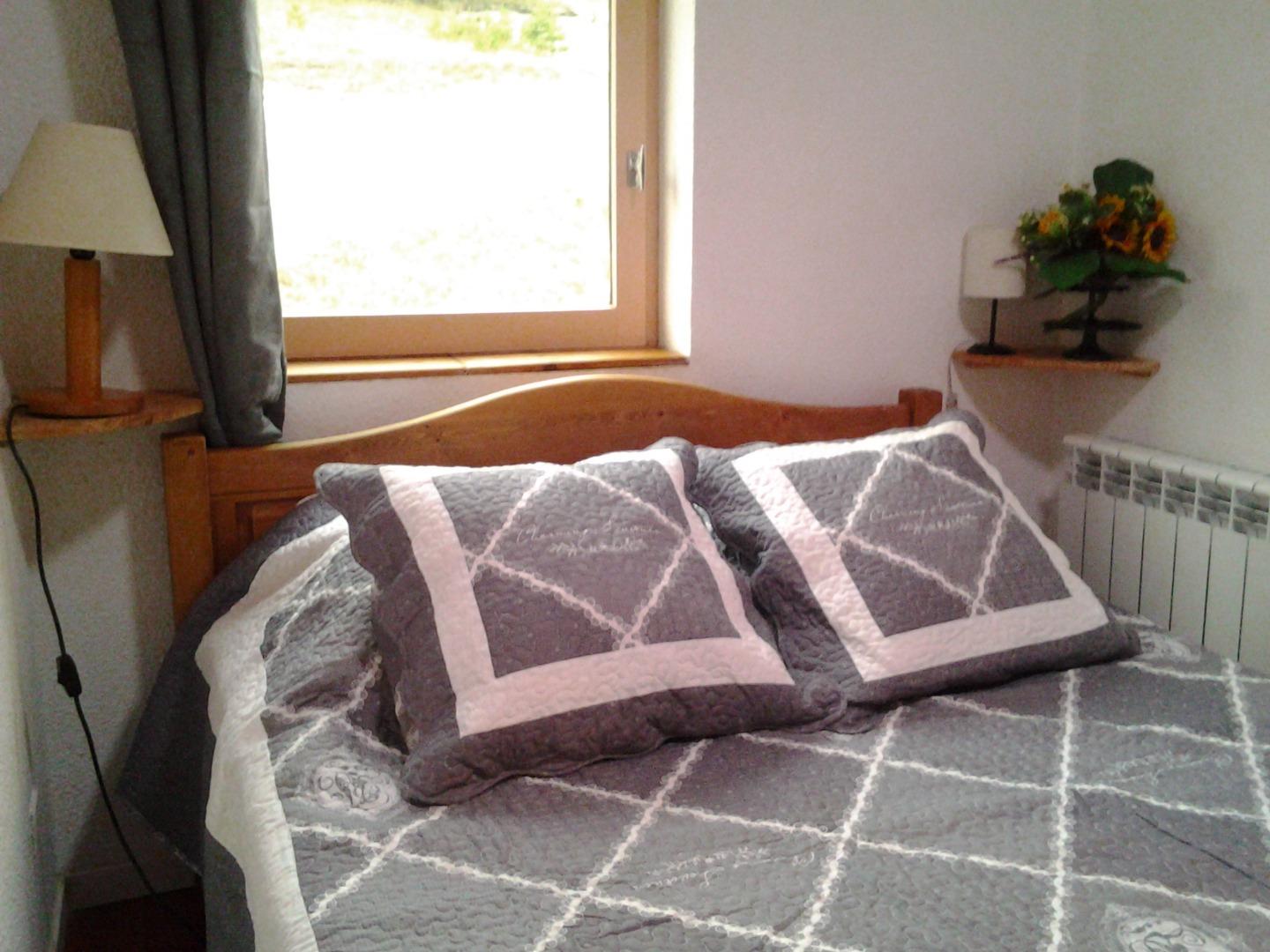 une chambre avec un lit double , une petite chambre ave des lits superposés , dans le séjour un canapé .